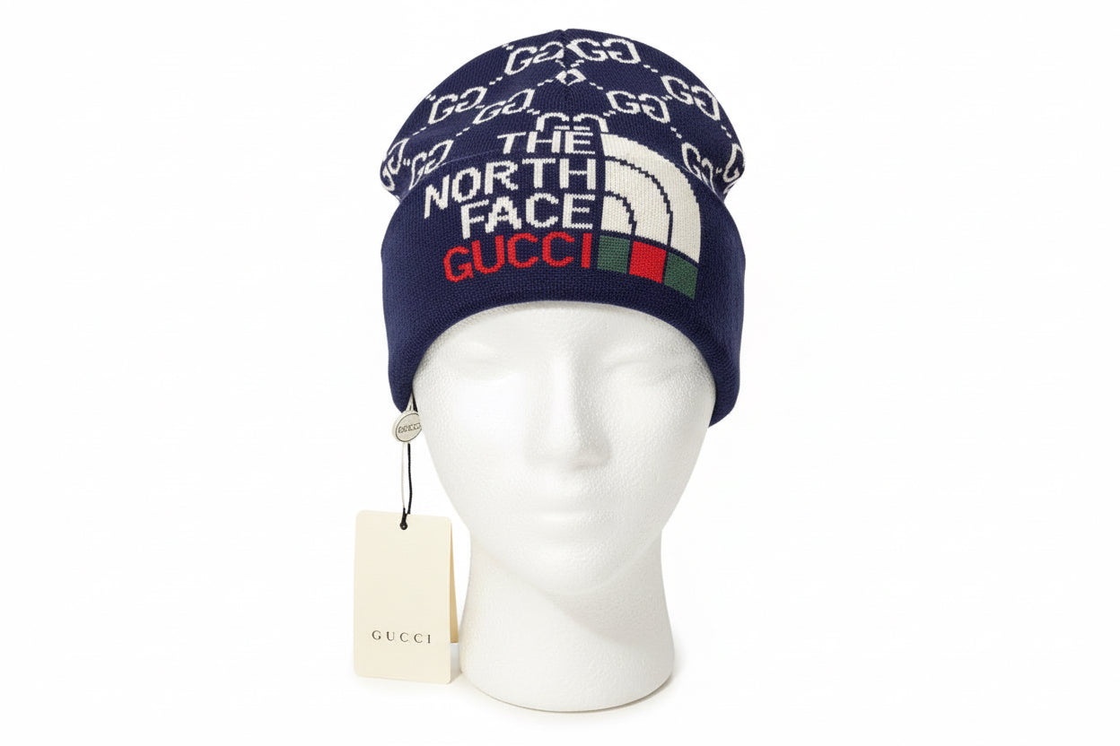 This beanie is a collaboration between luxury brand Gucci and outdoor brand The North Face. It features a classic black color and combines fashion and function for a stylish and practical winter accessory. Made with high-quality materials, it provides both warmth and style for any outdoor adventure or daily wear.